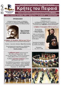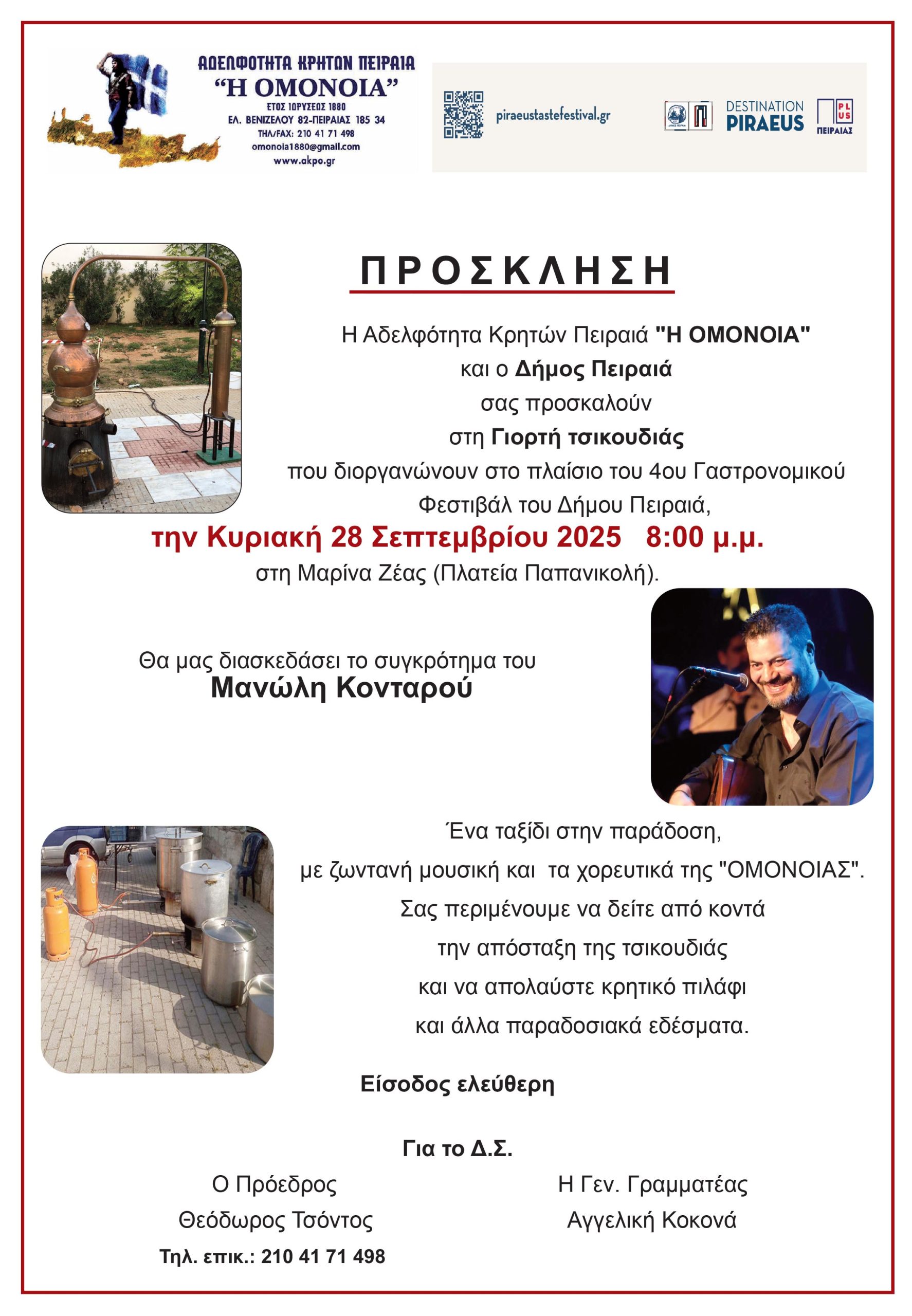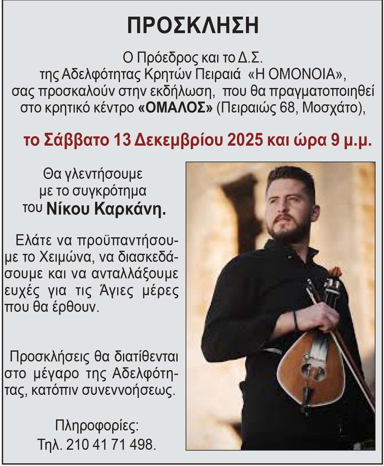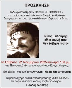 Η Αδελφότητα Κρητών Πειραιά «Η ΟΜΟΝΟΙΑ», σας προσκαλεί την Κυριακή 18 Μαΐου 2025 & ώρα 7 μ.μ.